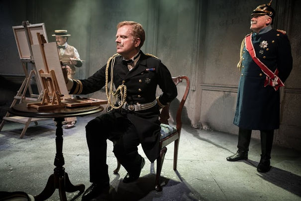 The technical elements of Sommer 14 are simple, but stunning and professional. Though the play spans all of Europe, the set is basic: a dilapidated interior that looks, with its crowning and engravings on the walls, to have once been grand. Each scene easily recreates itself from the last; the movements from Paris to Vienna to Berlin and Sarajevo, are made with ease, but none-the-less believable, thanks to shifts in light and sound. Costuming was impeccable and impressive considering the large cast playing multiple roles. Perhaps most striking as far as design was Bray's make up as Death. He opens the show pale with gray shadows highlighting his cheeks and a gruesome gun wound to the head, and with each scene, he grows whiter while the shadows darken and spread until his face has unmistakably become a skull. The changes are subtle - occurring slowly over the play's two-and-a-quarter hour run, and by the end the change is shocking but effective.